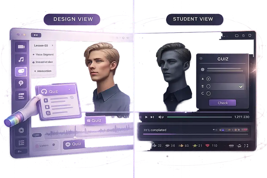Our visual drag-and-drop lesson builder allows you to combine video, audio, and interactive quizzes into a seamless flow. It's the visual power of Webflow met with pedagogical depth.