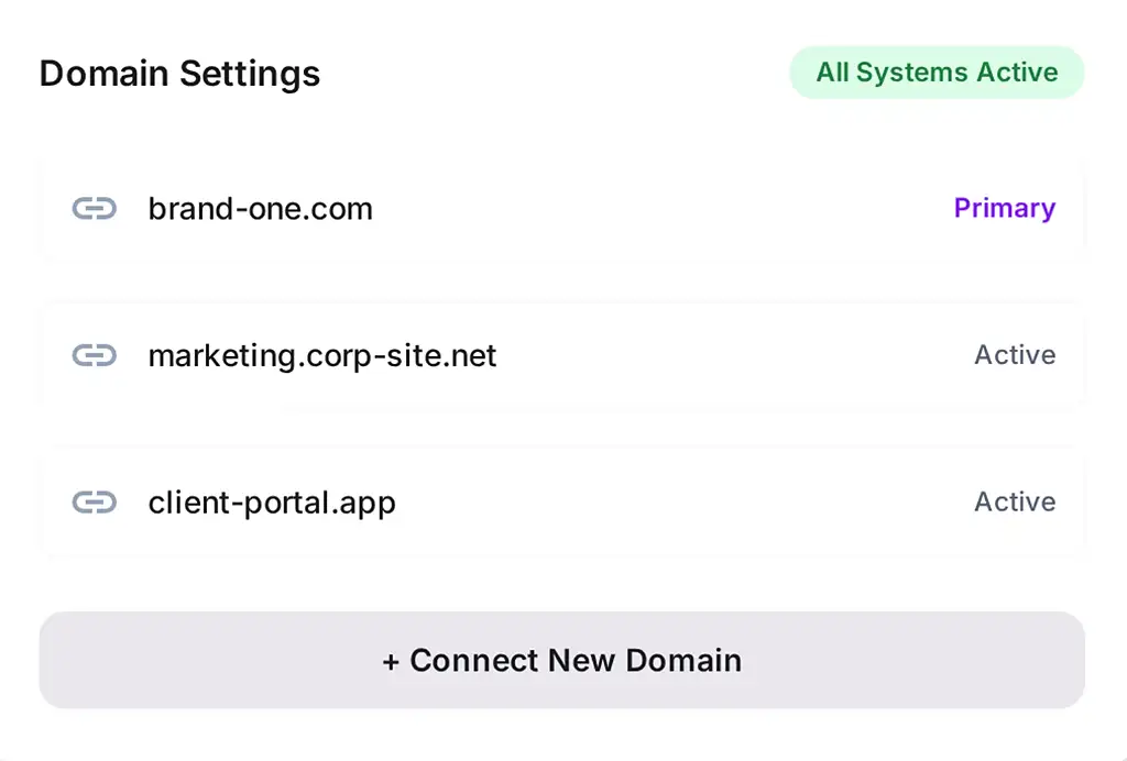Maintain independent identities for every brand while keeping operational overhead low. Connect any TLD in minutes.